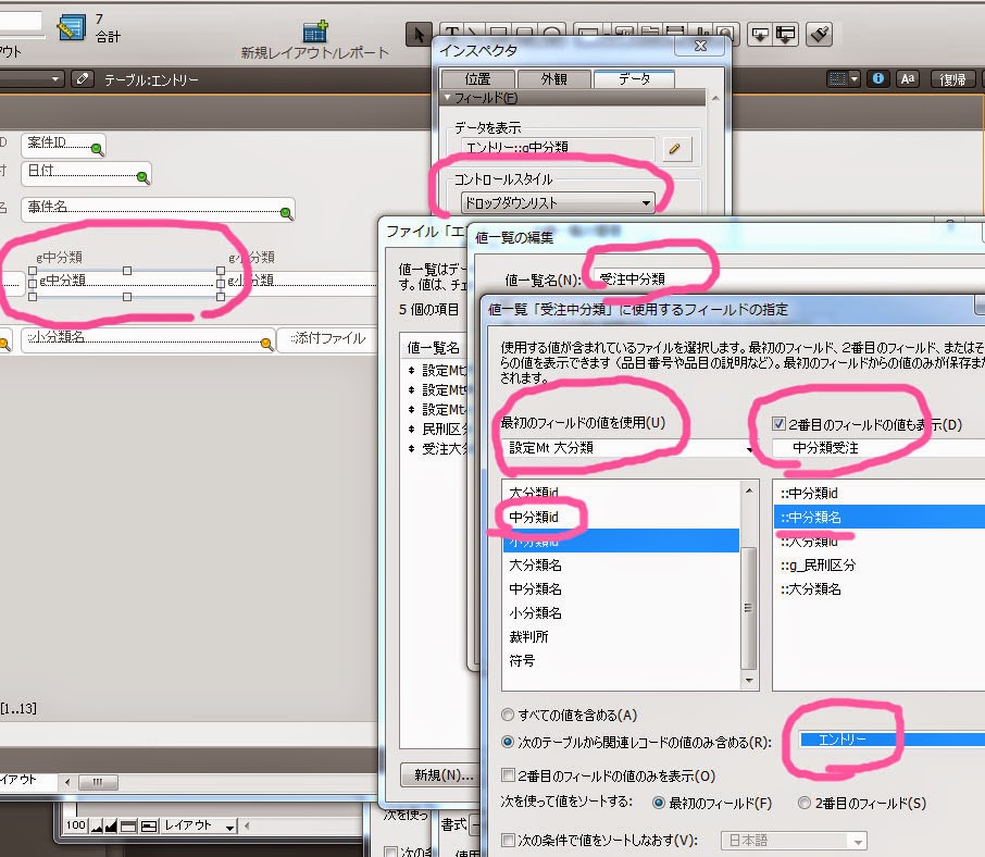 まず、レイアウトのg大分類をクリックしてアクティブにし、インスペクタからドロップダウンリストを選択します。そうすると、値一覧名を設定する画面が出てきますので、「受注大分類」と設定してください。更にフィールドの値を使用を選択すると、フィールドの設定画面が出てきます。